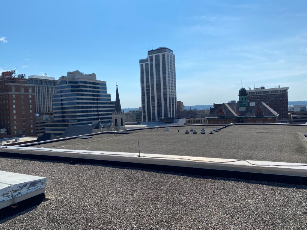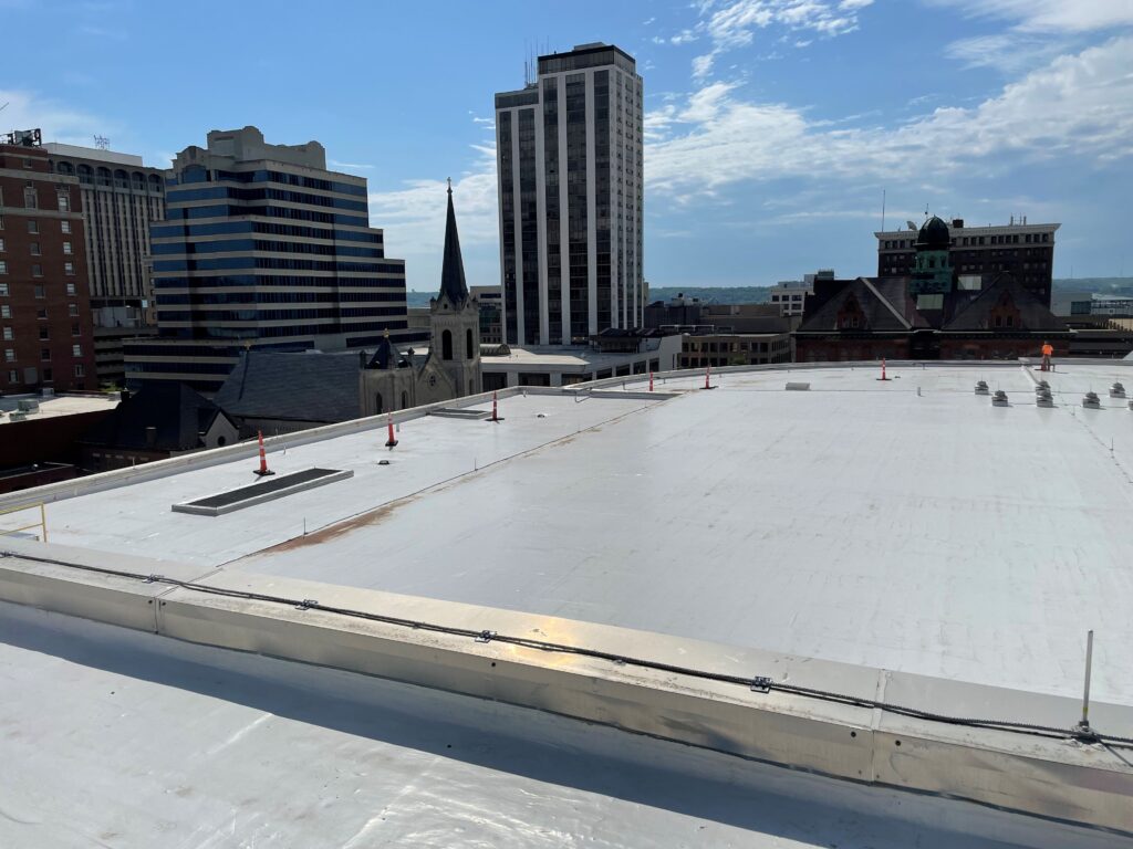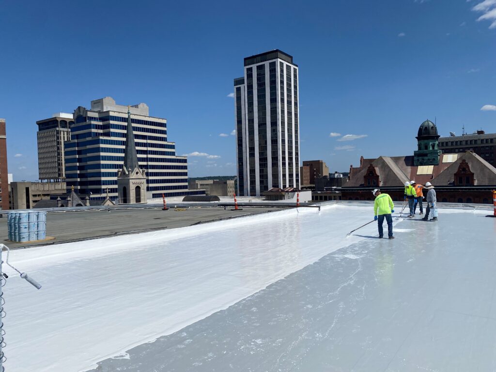 A base sheet was installed over the gypsum coverboard. Western’s crews coated the roof with a fabric-reinforced basecoat, followed by a final topcoat, Tremco Alphaguard Bio Plus, to achieve a 30-year warranty. Western also replaced the 18,300-square-foot roof over the meeting rooms.