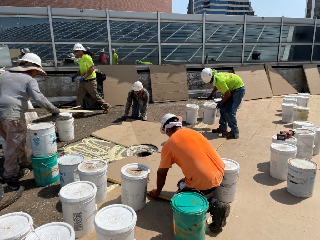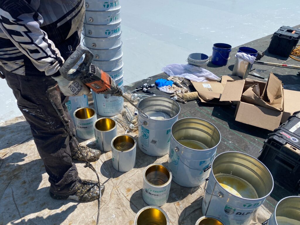 “When installing a roof coating, the weather weighs heavily on production, including temperatures of the substrate, dewpoint, humidity and/or moisture on the roof surface,” said Western Project Manager Jared Osterman. “After losing multiple production days due to heavy morning dew or rain from the night before, we began tarping off areas the night before to achieve a dry substrate. We also used a moisture meter to confirm the correct environment to apply the coating during the cooler rainy season. A gazebo was used on the roof to give our workers shade during the hot months when the project first kicked off. We used hot tents on the roof to help keep the buckets of coating material warm during the cool nights.”