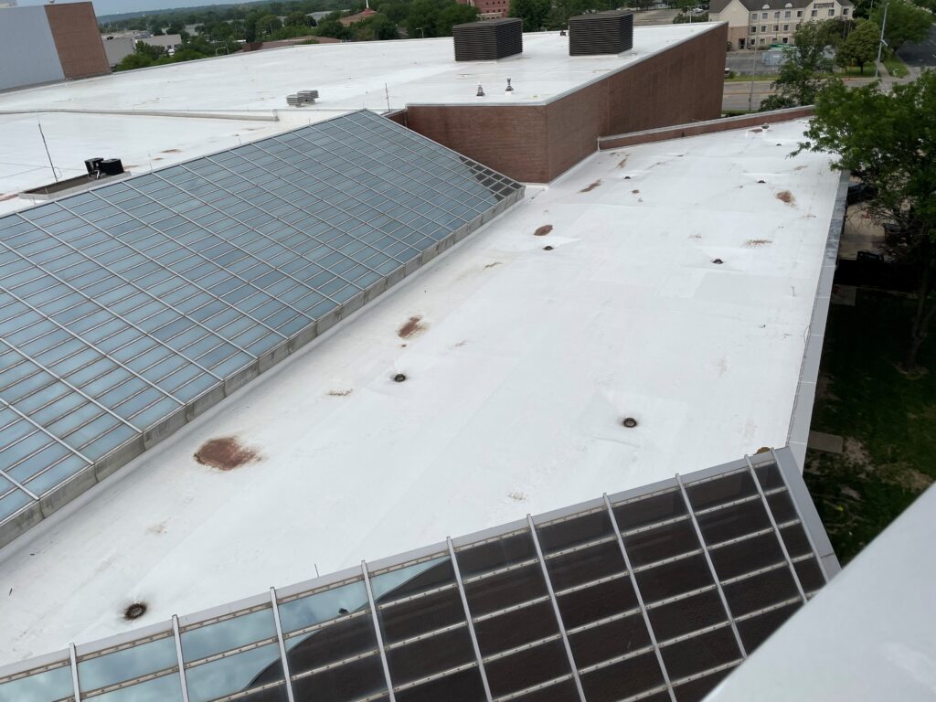 Western also replaced damaged 24-gauge stainless counterflashing and installed new 24-gauge stainless drip edge at tear-off locations on both roofs. Additionally, Western replaced a pair of hatches on the theater roof with Bilco Model F-50TB roof hatches. Midwest Lightning Rods replaced the lightning protection systems on both roofs to complete the projects.