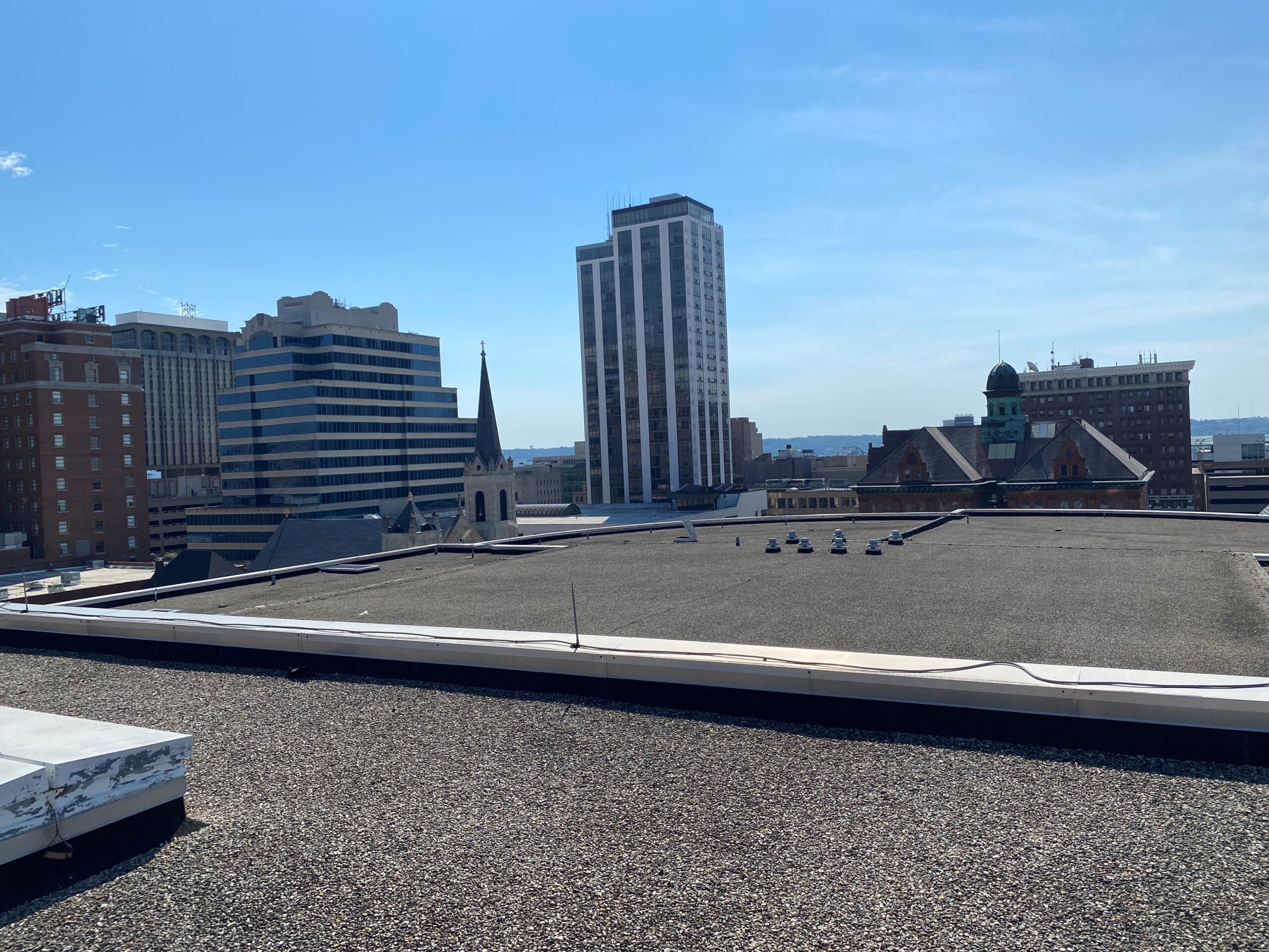Western also replaced damaged 24-gauge stainless counterflashing and installed new 24-gauge stainless drip edge at tear-off locations on both roofs. Additionally, Western replaced a pair of hatches on the theater roof with Bilco Model F-50TB roof hatches. Midwest Lightning Rods replaced the lightning protection systems on both roofs to complete the projects.