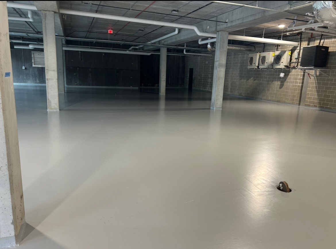 With the new complex set to open in August 2025, Western’s parking garage restoration experts were called in just before opening to repair cracks in the garage’s floor, install a cove joint, perform shotblasting and apply 16,000 sq ft of a three-coat vehicular traffic coating system.